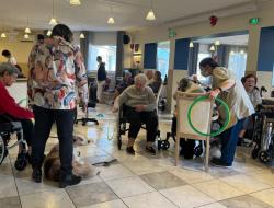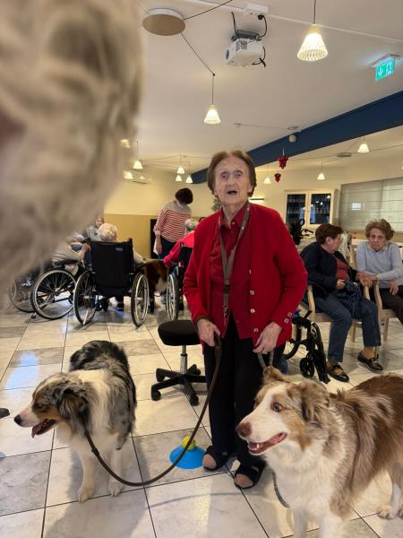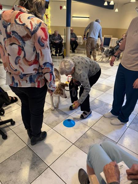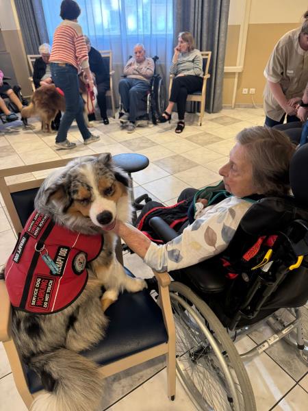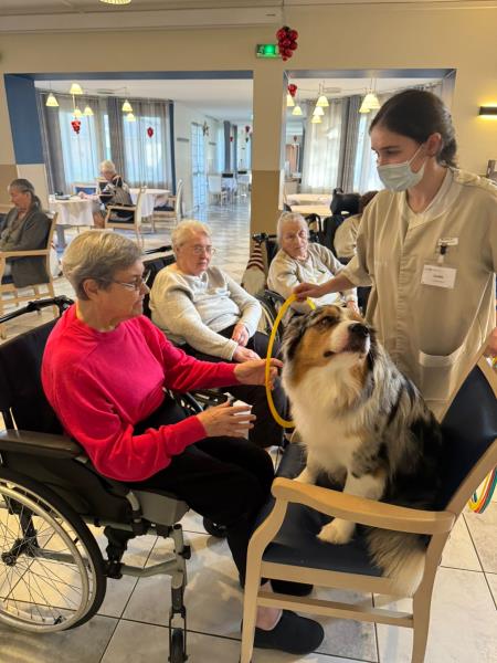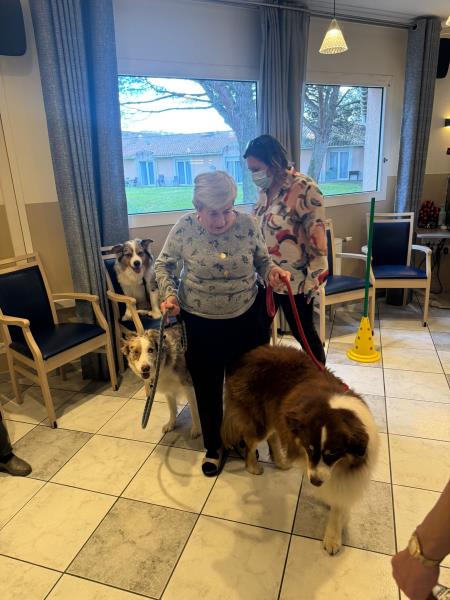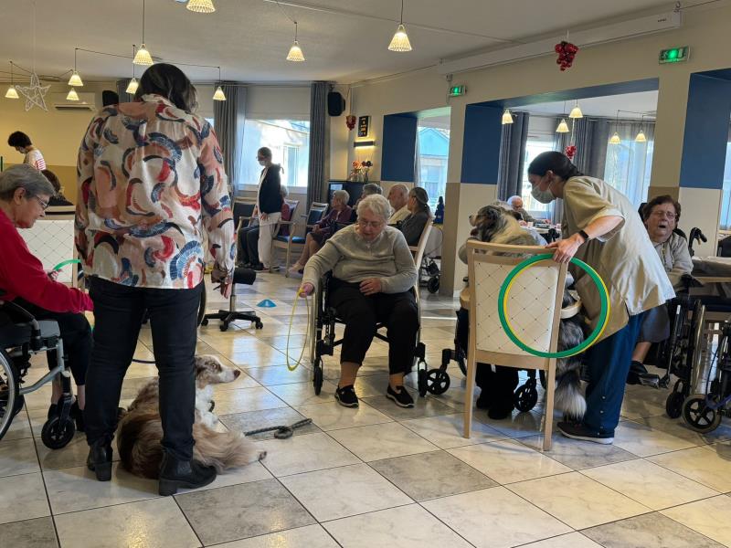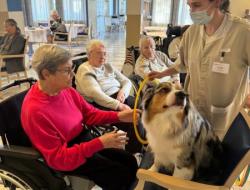 L’après-midi, place à la canithérapie, un moment particulièrement apprécié. La présence bienveillante des chiens a suscité de nombreux sourires et échanges, offrant aux résidents un temps de réconfort, de tendresse et de convivialité. Ces interactions ont contribué à apaiser les tensions, à stimuler la communication et à renforcer le sentiment de bien-être général.
