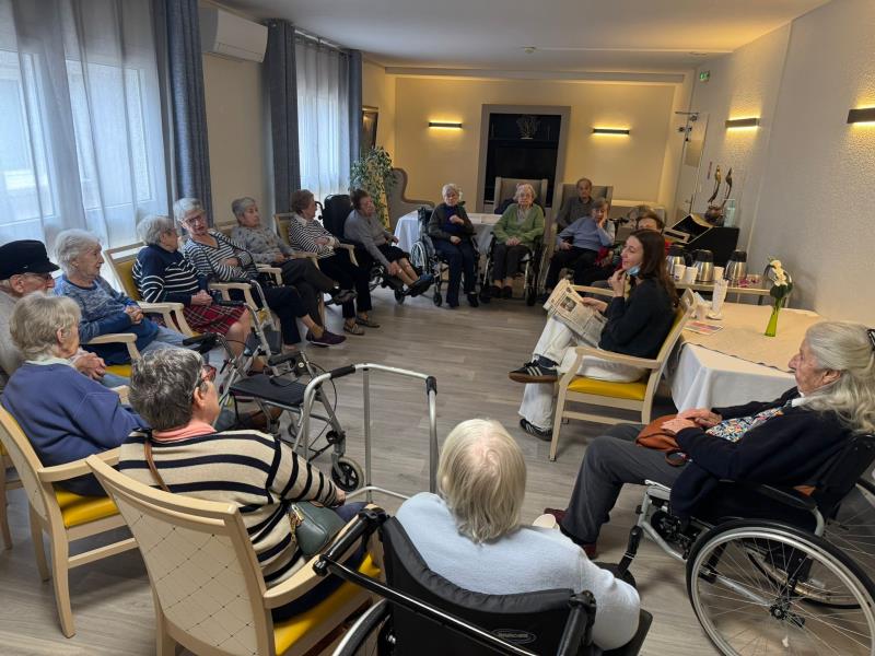 Pour commencer la semaine du bon pied, les résidents avaient rendez-vous ce matin pour la traditionnelle revue de presse. Ce moment d'échange est toujours très apprécié : il permet de parcourir les grands titres des journaux, de commenter l'actualité et de débattre dans la bonne humeur.